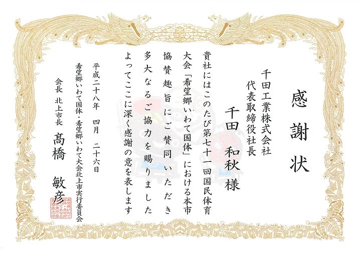 希望郷いわて国体 北上市協賛の感謝状を頂きました