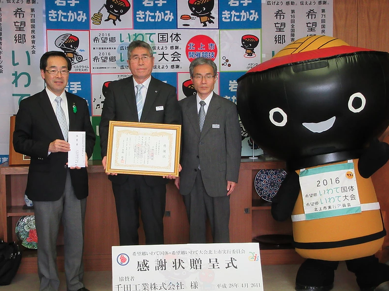 北上市長より第七十一回国民体育大会「希望郷いわて国体」における協賛趣旨に協力したことにより感謝状を頂きました。