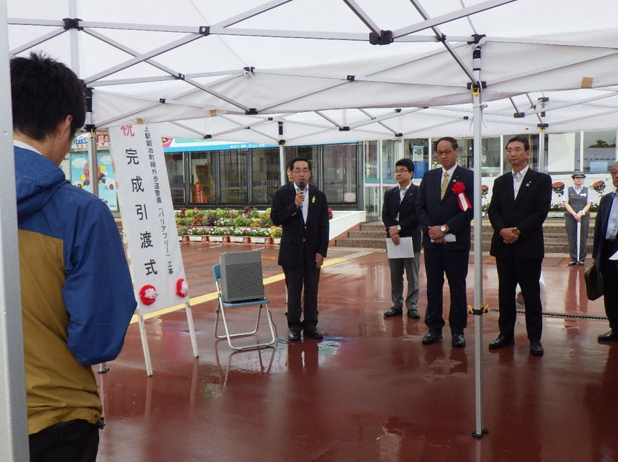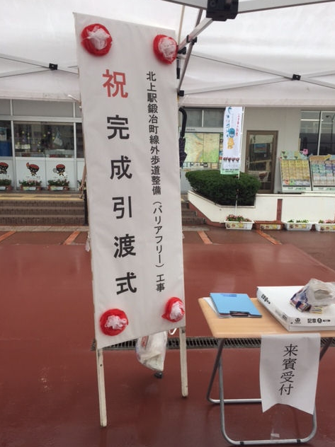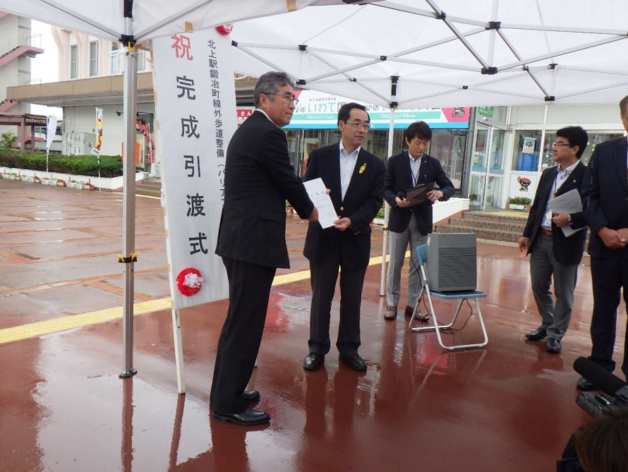 北上駅西口駅前広場にて『北上駅鍛治町線歩道整備(バリアフリー)工事』の引渡式が行われました。