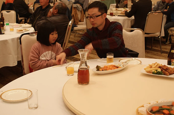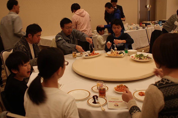 しっかりと学んだ後は、お楽しみの時間、家族のみなさんとの懇親会です。美味しい料理にくじ引き大会などで楽しかったです。