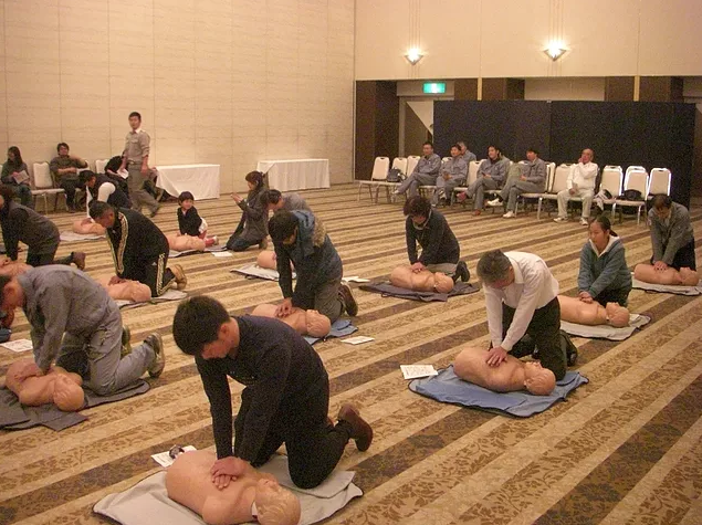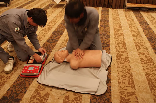 いざという時の救命救急(心臓マッサージとAEDの使用)の練習はみんな真剣です。