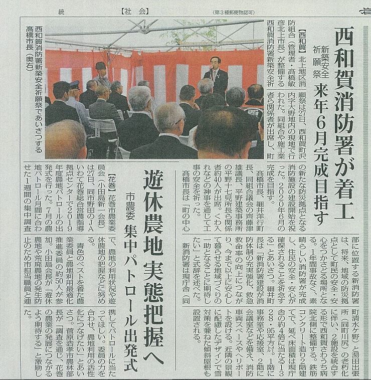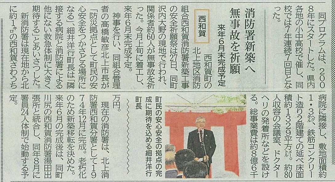 当日は地元新聞社、建設関係新聞社も駆けつけて頂き、翌日には各紙で安全祈願祭の様子を掲載していただきました。