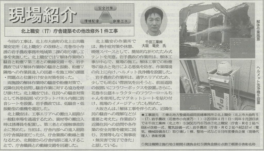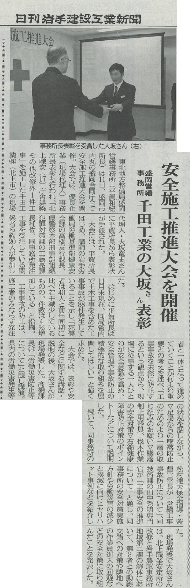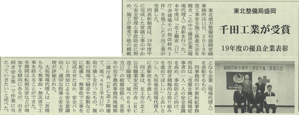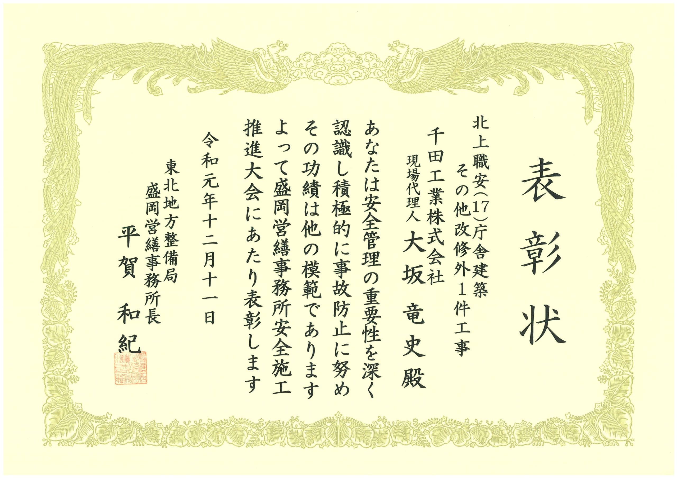 国土交通省(東北地方整備局盛岡営繕事務所)の工事安全施工推進大会にて、2018年に施工した工事を表彰して頂きました。