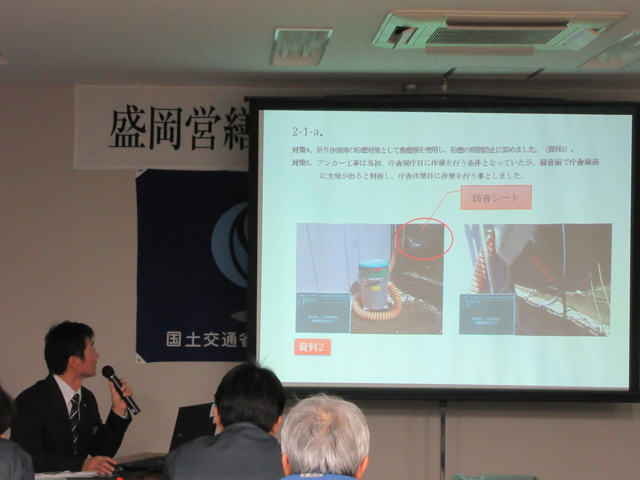 この工事は庁舎の改修と解体工事と言うこともあり、近隣にお住いの方や、庁舎内でお仕事をされている方への安全を第一に考えて施工させて頂きました。その時の安全対策、工夫、イメージアップなどの事例を、現場代理人の大坂より発表させて頂きました。