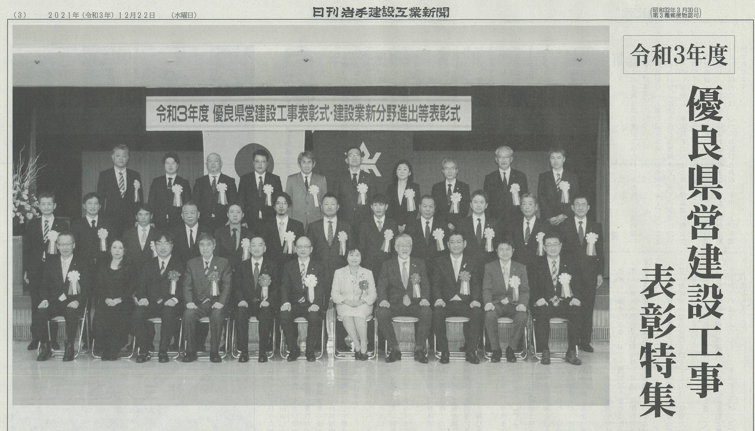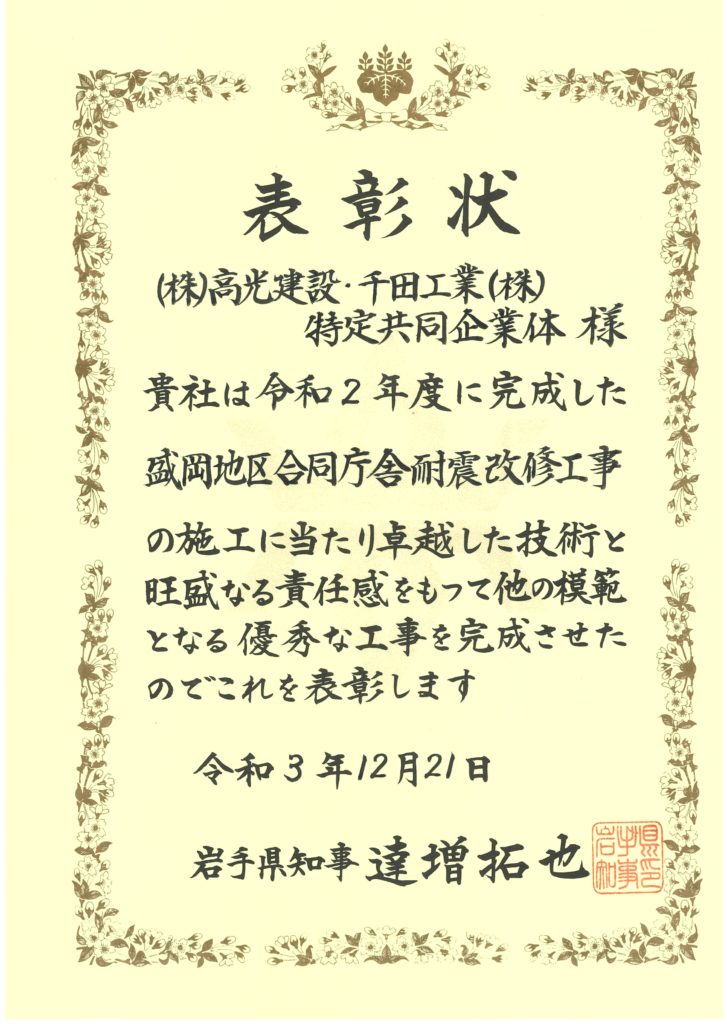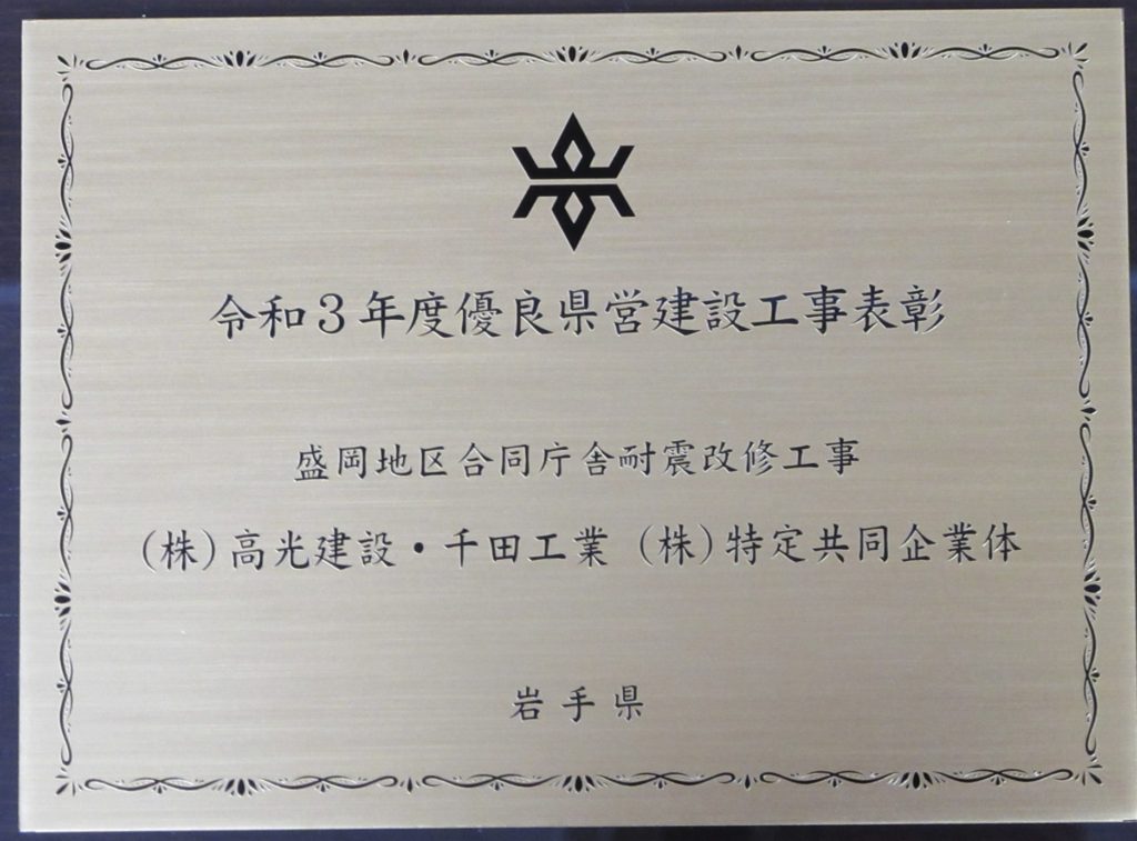 株式会社高光建設との特定共同企業体(JV)で臨み、令和2年に完成した「盛岡地区合同庁舎耐震改修工事」が、令和3年度 優良県営建設工事に選出され、12月21日(火)に表彰式が執り行われました。